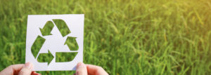 Cut paper with the logo of recycling over green grass. Recycling sign and symbol background banner concept