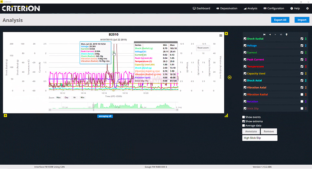 Extrema shows the maximum and minimum values for all displayed logged measurements while also giving the ability to locate each extrema data point along with its date/time stamp.