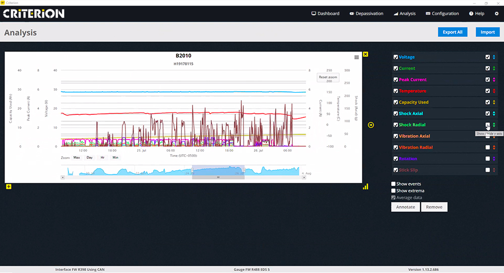 Highly graphical display of all logging information recorded. User selectable, multi axis scales, specific point value labels, unlimited zoom levels. Easy export of data and graphs for reports and data sharing.