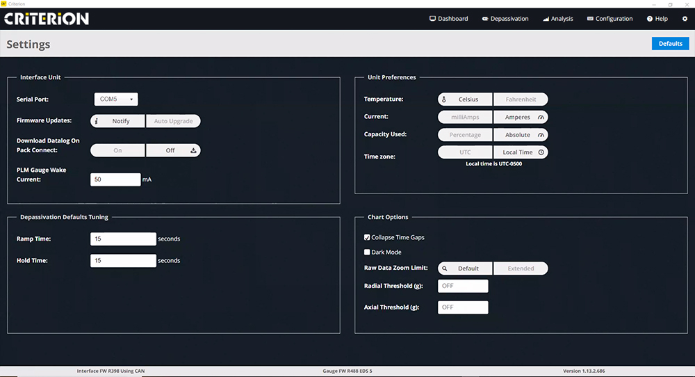 Interface Unit settings, Unit Preferences, Depassivation Defaults, and Chart Options for graphs, including new “Dark Mode”, can be selected here.