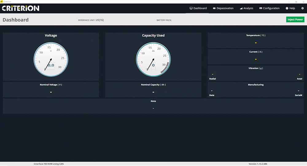 Displays real time Voltage and Capacity Used as well as live readings of Temperature, Current and Vibration. Other information such as Manufacturing Date and Serial Number, and a User Notes field are also displayed.
