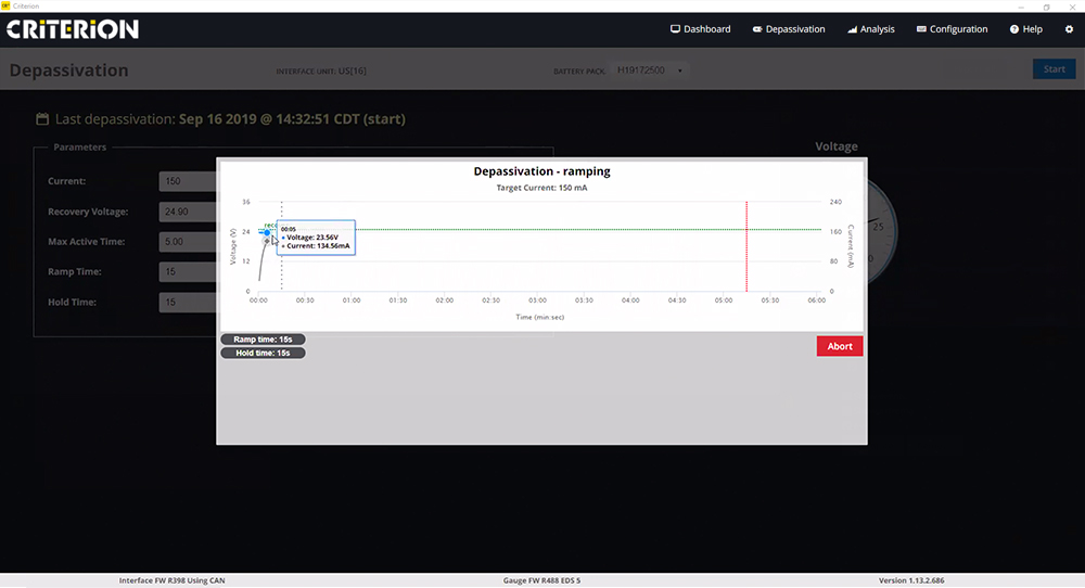 Full function depassivation featuring default parameters specific to the type of battery. Real time depassivation progress pop-up screen display the depassivation procedure progress.