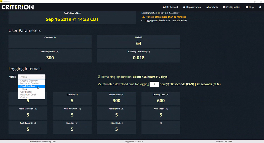 Each logged measurement’s logging interval can be individually set determining the resolution of the downloaded data. By selecting a logging interval, the effect on CR4 gauge memory duration can be seen along with an estimation of download time.